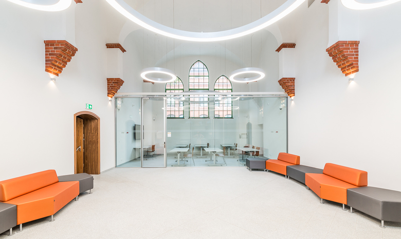 Alle neuen Elemente sind durch das Material Cortenstahl gekennzeichnet, das einerseits einen Kontrast zur historischen Bausubstanz bildet, anderseits durch seine Farbigkeit eine subtile Ergänzung zur Backsteinfassade darstellt. Das denkmalgeschützte Gebäude beherbergt heute eine der modernsten Ausbildungsstätten in der medizinischen Lehre in Polen. An elektronisch gesteuerten Patientenpuppen erlernen und vertiefen die Studierenden hier die praktische Anwendung ihrer medizinischen Kenntnisse.