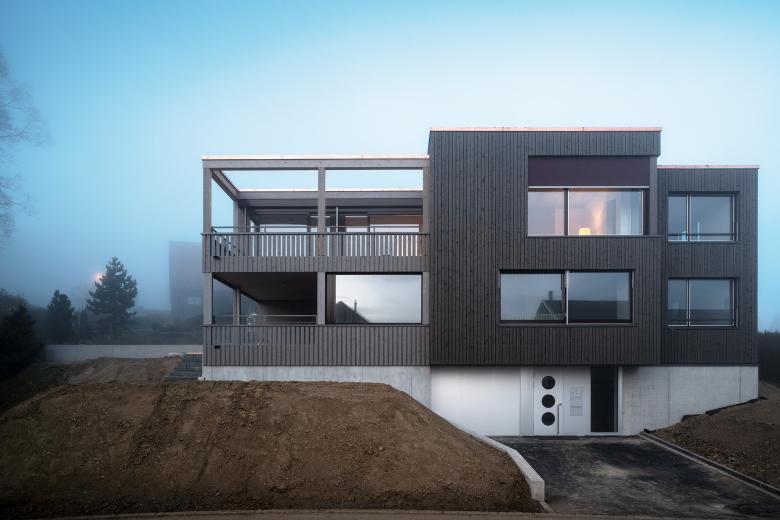 Das Zweifamilienhaus liegt in reizvoller, ländlicher Umgebung am Rande der Stadt St. Gallen mit Blick ins Appenzellerland. Der Ausblick sowie der Bezug von Innen- zum Aussenraum dienten als wichtige Gestaltungsbezüge. Das Wohnhaus besitzt Vor- und Rücksprünge, welche unterschiedliche Ausblicke in die Umgebung ermöglichen. Im Zentrum der beiden Geschosswohnungen steht jeweils ein betonierter Cheminéekern, um welchen sich die Zimmer anordnen. Die Wohnung im Obergeschoss besitzt ein überhohes Wohnzimmer mit einem präzis gesetzten grossen Eckfenster mit Blick in die appenzeller Hügellandschaft. Die Innenräume sind geprägt von natürlichen Materialien wie Sichtbeton, Weissputz und Eichenparkett. Die Aussenhaut besteht aus einer dunkel lasierten Bretterschalung. Der linke, niedrigere Hausteil, in welchem sich Jahreszeitenzimmer, Neben- und Aussenräume befinden, ist farblich leicht vom Hauptgebäude differenziert.