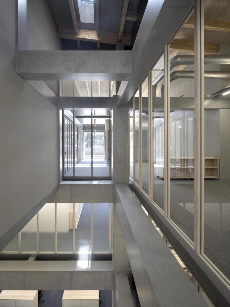 また、均質でブルータルな柱・梁で構成されたストラクチャーや普遍的な設備要素をベースとして、内部の環境を構成する執務エリアと共用エリア、吹抜やテラス、防煙垂壁などの建物をカタチづくるすべてのエレメントに優先順位を与えることなく状況に応じて等価なものとして捉え直し、ストラクチャーと明確に分けて立体的に組み合わせることで、ストラクチャーやその他エレメントとのズレや視線の抜けによる空間の差異をつくり、濃淡のある曖昧な領域をつくり出している。階を貫く二つの吹抜は、防煙垂壁や木枠サッシによる輪郭を持つヴォリュームとして空間に表出させている。高さ方向への延びやかさやつながりを生み、各階では緩やかに領域を分節するエレメントとなる。