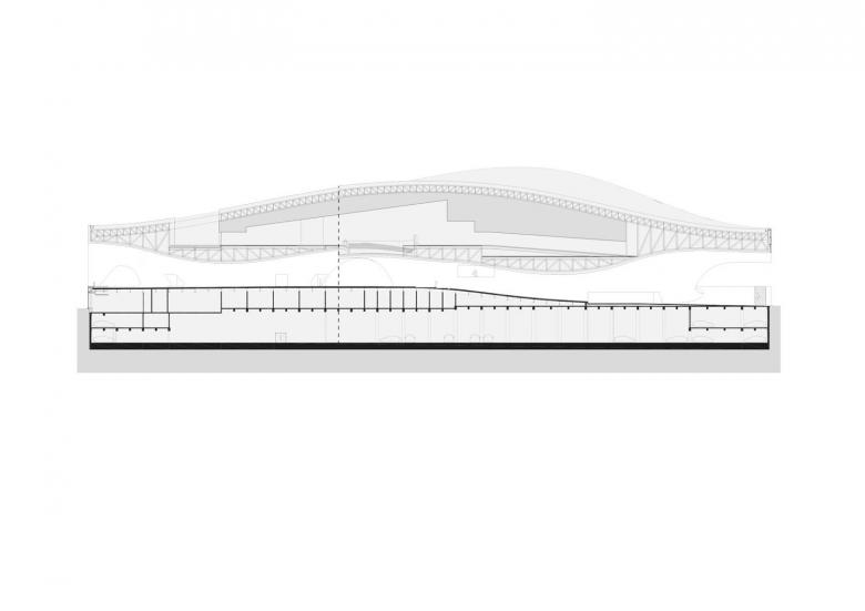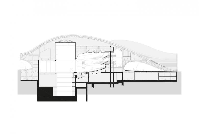 Where the roof touches the earth the building becomes an amphitheatre, open towards the surrounding parkland which, in turn, becomes both its stage and its set.