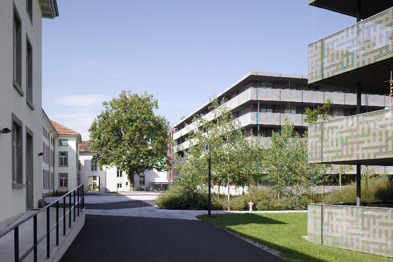 Die Seidenfabrik „Sidi“ wurde 1872 gegründet. Auf dem Gelände entstanden Verwaltungsgebäude, eine Shedhalle, ein gemauerter Hochkamin mit Kesselhaus, sowie Arbeiterwohnhäuser. Die Setzung der vier- bis fünfgeschossigen Volumen orientiert sich an der bestehenden Bebauungsstruktur. Ein Hofgebäude ersetzt die abgebrochene Industriehalle als Zentrum des Areals. Es umfasst einen grosszügigen,mit Bäumen bepflanzten Innenhof. Zwischen diesem grössten Volumen und dem anschliessenden Siedlungsteppich werden drei grosszügige Aussenräume freigehalten. Es entsteht somit ein Siedlungsschwerpunkt, wo gleichzeitig alte und neue Bebauungsstruktur, aber auch verschiedene Nutzungen zusammentreffen.