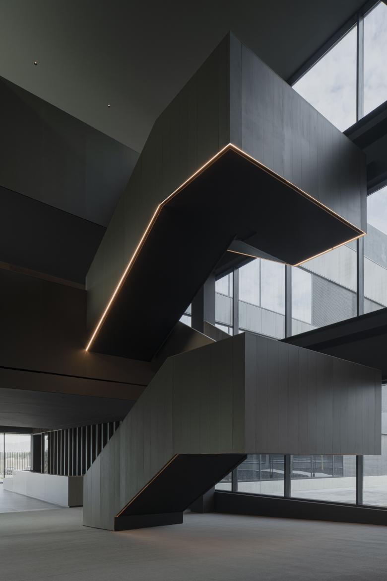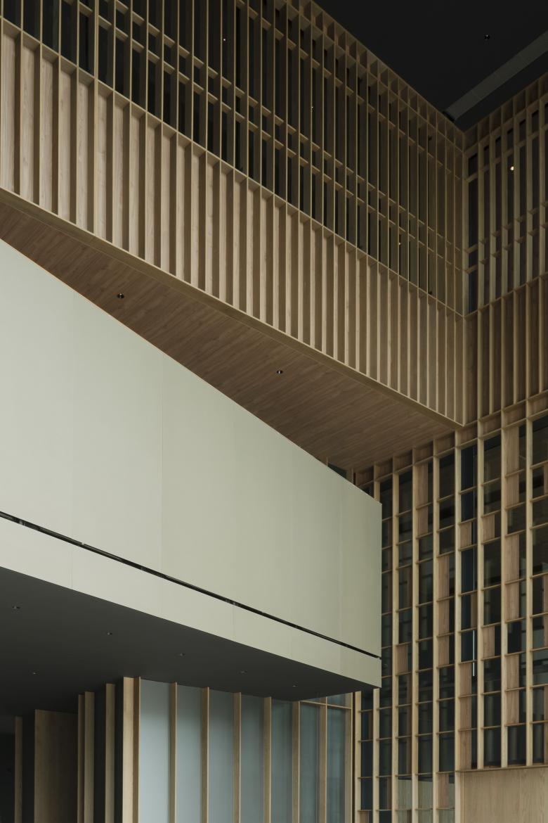 A partir del principal acceso al edificio corporativo, la recepción funciona de distribuidor hacia las plantas superiores, dejando a un lado un gran auditorio, y al otro, salas de reuniones, comedor y un gimnasio para los empleados. Es aquí donde se descubre por primera vez la trama narrativa del proyecto: la celosía de madera de nogal blanco, planteada en diferentes formatos, que recorrerá todo el espacio. Principalmente, este sistema resguarda de la luz natural demasiado intensa, pero también sirve para fomentar el sentido de conexión entre las diferentes áreas, además de proporcionar una capa de intimidad al asociarse con paneles de vidrio fumé gris.