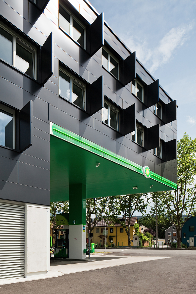 Durch die Überhöhe erhält die Tankstelle optimale Belichtungsverhältnisse und schafft eine angenehme Aufenthaltsqualität zu jeder Tageszeit. Die Zu- und Abfahrten im Tankstellenbereich bleiben unverändert und verlaufen getrennt von der Einfahrt des Studentenheims. Der auf der Längsseite asymmetrisch geknickte Baukörper wirkt leicht, wenn nicht sogar verspielt, vor allem durch die schwarze, metallische Gebäudehülle, die dem Grün des Tankstellenbereiches zu noch mehr Aufmerksamkeit verhilft. Der Knick in der Fassade schafft zudem einen einladenden Vorplatz für das Studentenheim mit einem klar ersichtlichen Haupteingang und trägt auch zur Abschirmung des Strassenlärms bei.