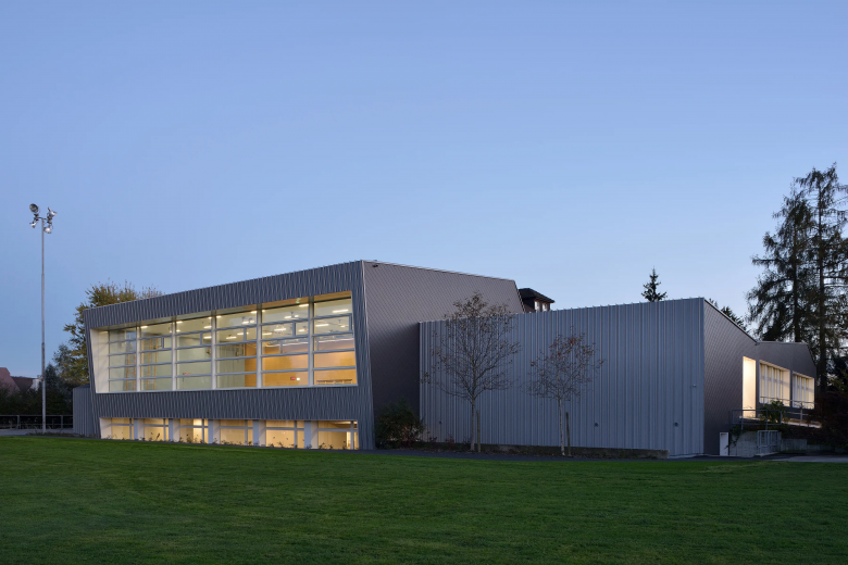 Das Primarschulhaus in Basadingen aus dem Jahr 1969 grenzt an einen erhaltenswerten Schulbau aus dem 19. Jahrhundert. Die maroden Flachdächer eines Zwischentrakts und der Turnhalle wurden zu Schrägdächern ausgebaut, um geschickt die kontrollierte Lüftung mit Wärmerückgewinnung für die Garderoben aufzunehmen. Die Dach- und Fassadenverkleidung wurde mit durchgehenden Aluminiumprofilen als zusammenhängendes Band neugestaltet. Zur Einbettung in die ländliche Umgebung wurde an den Giebelfassaden Eternitwaben verwendet.