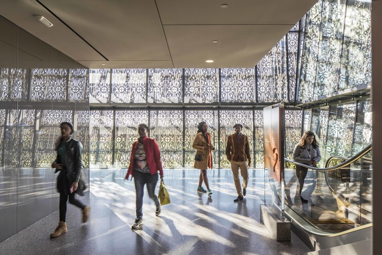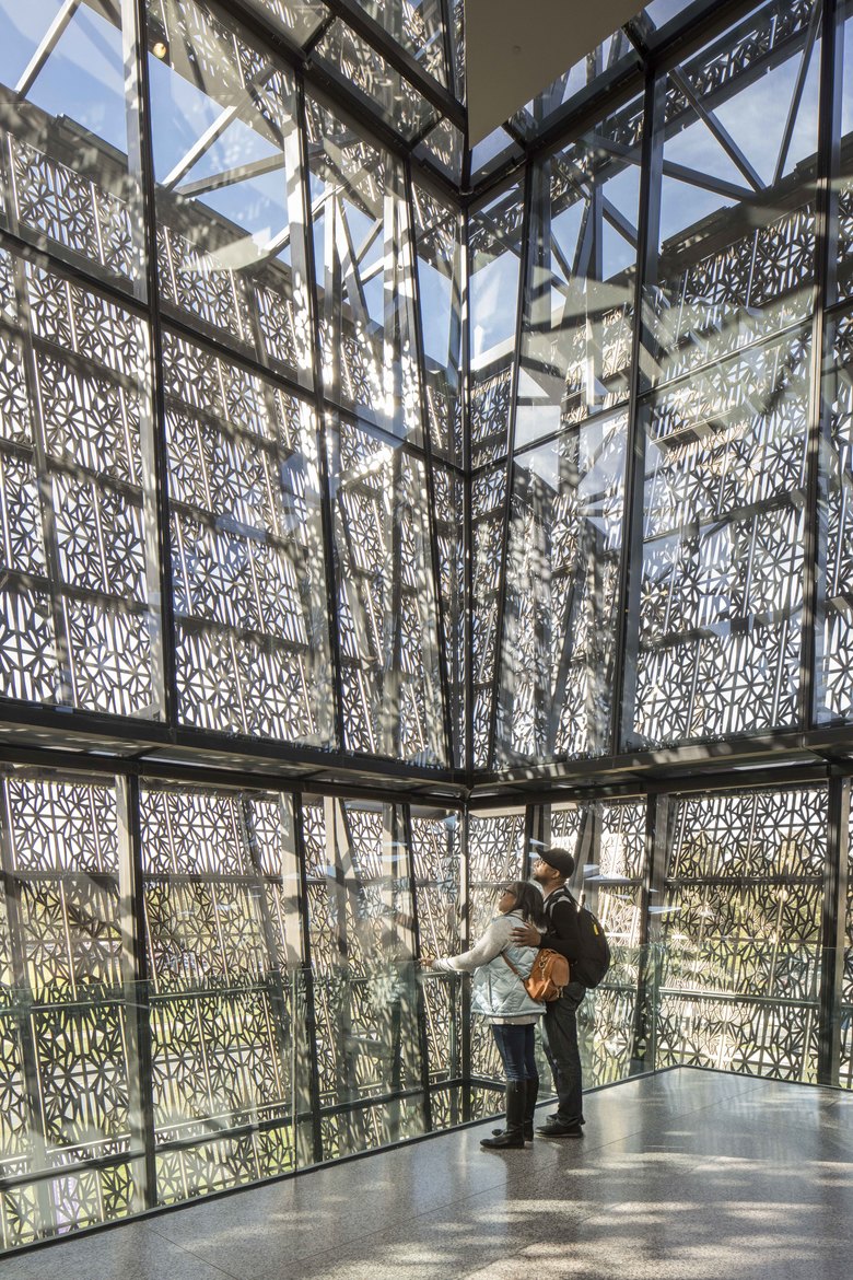 To stay true to the master plan of The Mall, to bridge the old world with the new, and to cover the vast amount of history and culture for this space; 60% of the museum is actually located below ground making it the deepest museum on The Mall at 70ft. deep (21 m). This allows for five stories above ground and five stories below ground. Slated for LEED Gold certification, the first Smithsonian ever to achieve such a status, the National Museum of African American History and Culture’s (NMAAHC) exterior skin helps this impressive project receive this status. Inspired by the three-tiered crop used in Yoruban art from West Africa, the ornamental bronze-colored metal lattice pays homage to the intricate ironwork that was crafted by enslaved African Americans in South. The lattice work itself opens the building to streaming exterior daylight and can be modulated according to the season. Allowing for a historical and emotional journey, the interior is characterized by vast, column-free spaces, and a material palette made up of pre-cast concrete, timber and glazed skin that sits within the bronze lattice work. Integrating its architectural form with its purpose and function, the NMAAHC tells a story, the American story, through the lens of African American history and culture.
