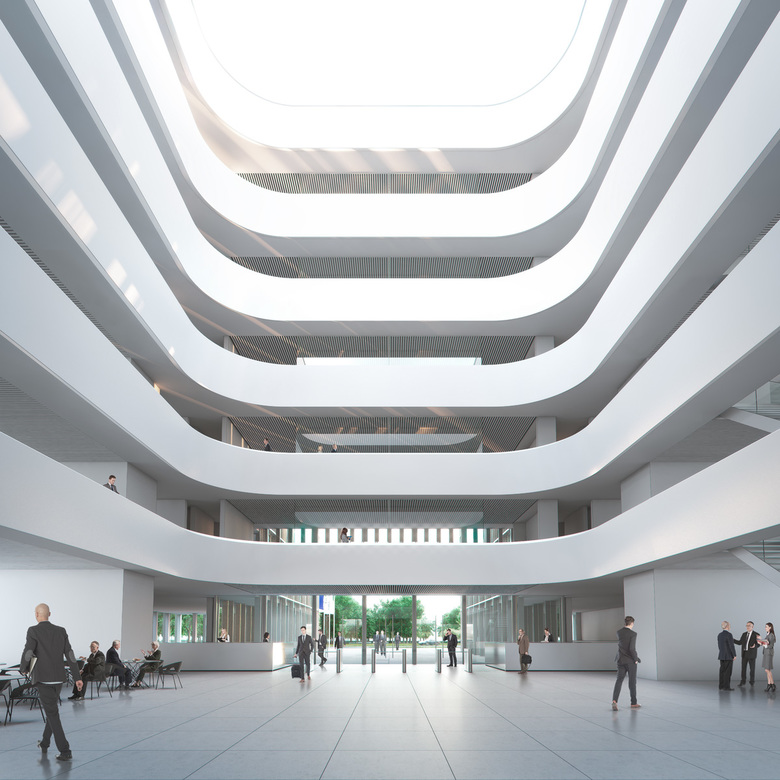 Der Komplex wird zwischen dem zweiten und dritten Riegel über eine zentrale Zuwegung mit Vorfahrt erschlossen. Von hier erfolgt der Zugang zum Herzstück des Gesamtkomplex, dem zentralen Forum. In dem Atrium öffnet sich der Raum über alle Geschosse und wird von oben natürlich belichtet. Im Erdgeschoss sind um das Atrium ein Café und Dienstleistungsangebote für die Mitarbeiter, wie ein Kiosk, der Concierge-Service, Apotheke und Reinigung angeordnet. Seitlich daran angegliedert liegen Co-Working-Spaces und Konferenzbereiche.