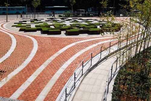Inspired by the natural texture of the earth, the whole surface of the site is covered with one coherent skin of undulating strips, which resembles the water tides flowing up and down. While shedding the existing underground parking lot, this skin of free form also helps to connect two adjacent lots interrupted by traffic. The linear paving pattern also suggests a strong sense of dynamic urban activities. Along with the flow of the strips, oasis of flower islands are randomly arranged to create pleasant and intimate urban enclaves against the chaotic surrounding urban environment.