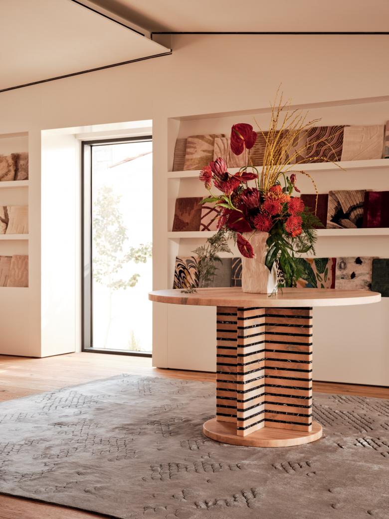 Upon entering, visitors are greeted by the Bungalow’s open interiors, a sun-drenched conversation pit, a nostalgic centerpiece that embodies the essence of retro chic. The adjacent Cushion Display Room features floor-to-ceiling display cases in lacquered veneer, showcasing exquisite hand-woven wool and silk cushions, crafted by renowned designers. Each piece reflects an unwavering commitment to quality and artistry.