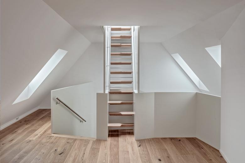 Totalsanierung im Leerstand - die Qualität der klassischen 3-Zimmerwohnunen mit kleiner Küche und Bad wird mit kleinen Eingriffen auf den heutigen Stand angehoben. Die Zimmerschicht gegen die Luisenstrasse bleibt räumlich erhalten, die hofseitige Raumschicht wird reorganisert und neu gegliedert. Bäder und Küchen werden leicht vergrössert und neu angeordnet. Die Haustechnik wird komplett erneuert, im Gegensatz dazu wird die Statik so wenig als möglich beinflusst. Das Dachgeschoss wird komplett erneuert bzw. das Dach soweit erhöht, dass eine Maisonettewohnung mit Dachterrasse erstellt werden kann.