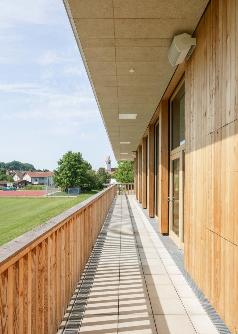 Am nördlichen Ortsrand entstand die neue 1,5-fach Halle für den Vereinssport in unmittelbarer Nachbarschaft zur Grund- & Mittelschule sowie zum bestehenden Sportareal. Durch die etwas erhöhte Lage zur Mindelheimer Straße prägt der aus der Funktion und Topografie entwickelte, solitärhafte Neubau hier das Ortsbild nun mit. Auf der Ebene von Schule sowie Parkplatz und somit um ein Geschoss erhöht zum Hallenniveau liegt der Eingang. Hier öffnet sich das Bauvolumen mit einem durchgehenden Einschnitt als überdachter Vorbereich und Übergang zu den tieferliegenden Außensportflächen. Die Halle selbst liegt im Westen und alle Nebenräume sowie zusätzlichen Nutzungen schließen auf die Tiefe der Halle zweigeschossig im Osten an. Der Grundriss ermöglicht somit in beiden Ebenen eine absolut klare Orientierung und Mehrfachnutzungen. So leisten Foyer und Flur auf dem Eingangsniveau zugleich die Funktion als durchgehende Tribüne zur Sporthalle hin. Direkt beim Eingang liegt zentral das Vereinsheim mit den Besuchertoiletten und einem überdachten Freisitz. Dieser Terrassenbereich kann zusammen mit dem durchlaufenden Balkon zum Rasensportfeld hin auch als überdachte Zuschauerzone genutzt werden und ist über die Freitreppe direkt mit dem Sportplatz verbunden. Die Hallenebene mit den Garderoben und Geräteräumen liegt niveaugleich zu Rasensportfeld und Laufbahn und die Umkleiden können durch die direkten Zugänge von außen auch von den Freiluftsportler mit genutzt werden.