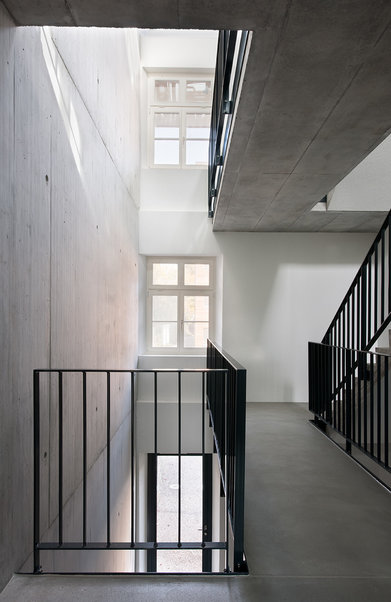 Die Volumen von unterschiedlicher Höhe und Länge definieren drei Höfe mit differenzierten Charakteren und unterschiedlicher Gestalt. Durch den einheitlichen Kiesbelag ist das Mühleareal zu einem öffentlichen und fussgängerfreundlichen Quartier geworden. Die neuen Wohnungen profitieren durch ihre Ausrichtung von diesen Aussenräumen. Terrassen und Eingänge sind in die Volumen eingeschnitten, was den Gebäuden monolithischen Charakter verleiht. Die drei Neubauten sind in Holzkonstruktion ausgeführt. Die Aussenhaut besteht aus horizontalen Holzlamellen. Diese horizontale Struktur ist als Hommage an das alte Getreidesilo zu verstehen, welches diesen Ort geprägt hat. Um die Privatsphäre der Bewohner zu gewährleisten ist das Erdgeschoss leicht vom Terrain abgehoben. Ein Betonsockel gleicht die Niveaudifferenz aus.