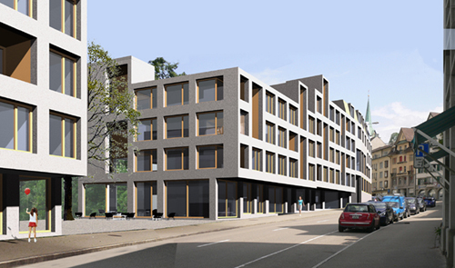 Die nach dem Abbruch des alten Sackbahnhofs begonnene städtebauliche Entwicklung wird mit der vorgeschlagenen Bebauung weitergeführt. Der städtische Charakter soll auch im unteren Bereich der Bahnhofstrasse spürbar werden. Der Strassenraum wird durch die neue Zeilen-Bebauung definiert. Im oberen Bereich (Hotel) noch stark geschlossen, öffnet sie sich in Richtung Bahnhof immer mehr und lässt Durchblicke und Durchgänge zur parkartigen Freifläche zu