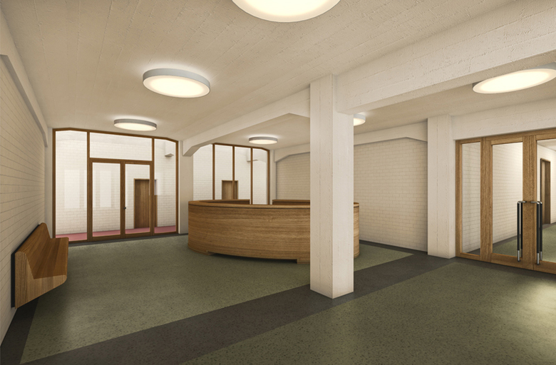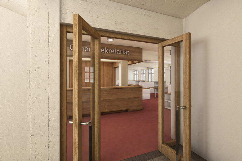 Von der Rohrerstrasse gelangt der Besucher zwischen der weit geöffneten Umfriedungsmauer hindurch zur eingezogenen Vorhalle am Zeughaus. Empfangen wird er am Schalter in der grosszügigen, durch rückseitige Oblichter belichteten Halle, in der alle Wege zu den Abteilungen und den Sitzungszimmern vorbeiführen (Sichtkontrolle). Anschliessend an die Empfangshalle vermittelt die Treppenhalle zwischen dem Eingang und dem Bereich der Sitzungszimmer. Gleichzeitig bildet sie den Auftakt zu den Geschossen. Auf denen ist jede Abteilung mit einem Sekretariat unmittelbar an den Treppenhallen gut auffindbar vertreten. So ist sichergestellt, dass die Besucher, ob begleitet oder unabhängig unterwegs, kontrolliert in die Abteilungen gelangen. Gleichzeitig kann das Sekretariat an dieser Stelle auch die Rolle einer sozialen Kontrolle wahrnehmen.