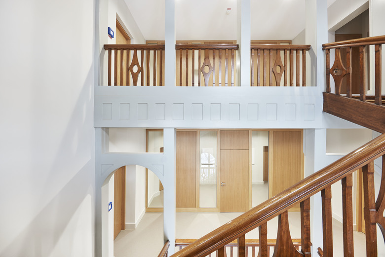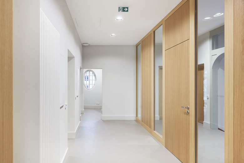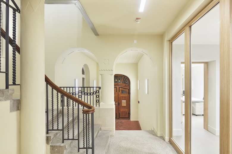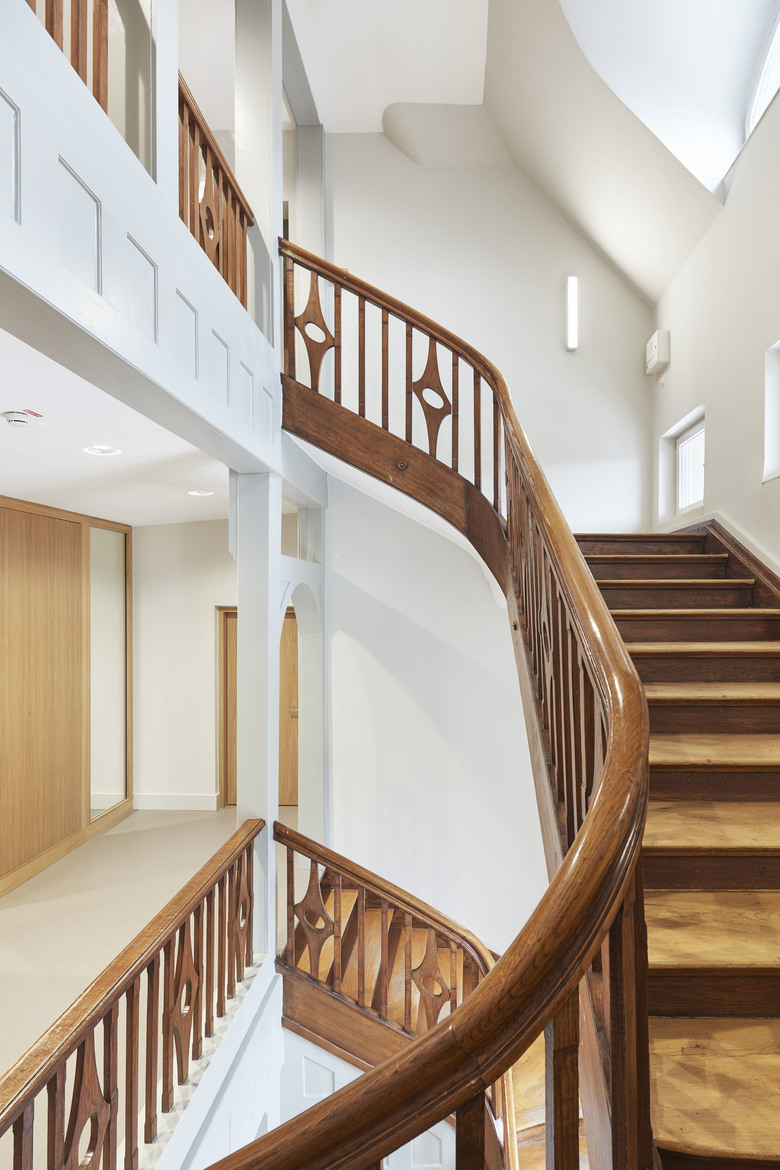 Im Inneren stellen Material- und Farbkonzept von Böden, Flächen und neuen Holz-Glas-Wänden bewusst einen atmosphärischen Bezug zur historischen Wohnnutzung her und bilden einen harmonischen Übergang zu den beeindruckenden Jugendstilelementen des Dielentreppenhauses und des Eingangsportals.
