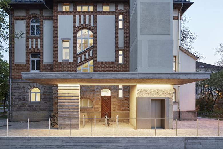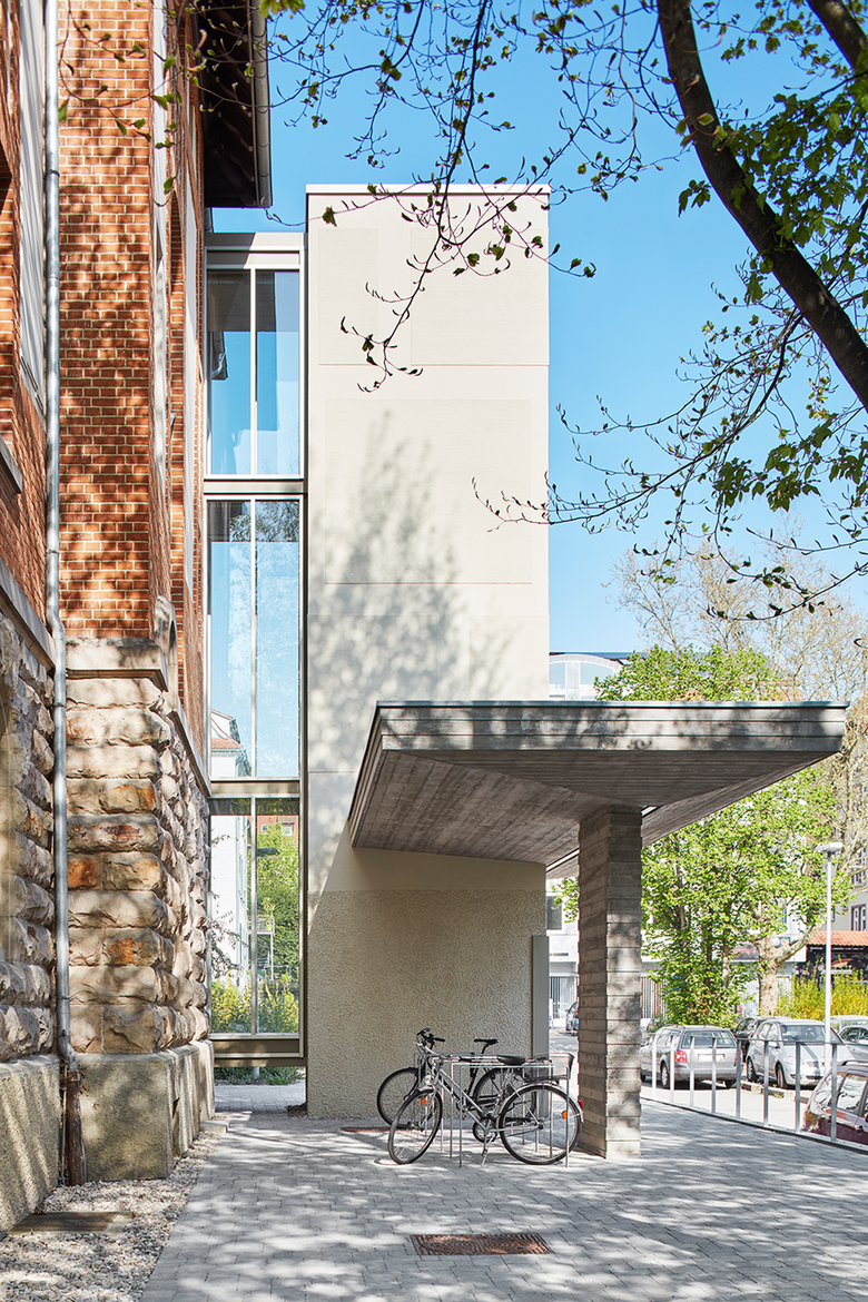 Um die öffentliche Einrichtung barrierefrei zugänglich zu machen, wurde der Bestandsbau um einen beeindruckend modernen Anbau ergänzt: ein von außen zugänglicher Aufzugsturm mit erweitertem Eingangsvordach und verglasten Brücke über drei Etagen. Diese erinnert als Motiv an die historische Verbindung zwischen dem ehemaligen Wohnsitz der Direktoren und der Alten Chemie durch eine Gebäudebrücke. Gleichzeitig verbindet das weite, mit Sichtbeton konstruierte Vordach das geschlossene Gebäude mit dem öffentlichen Vorplatz.