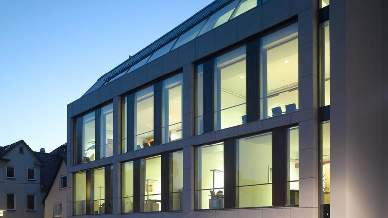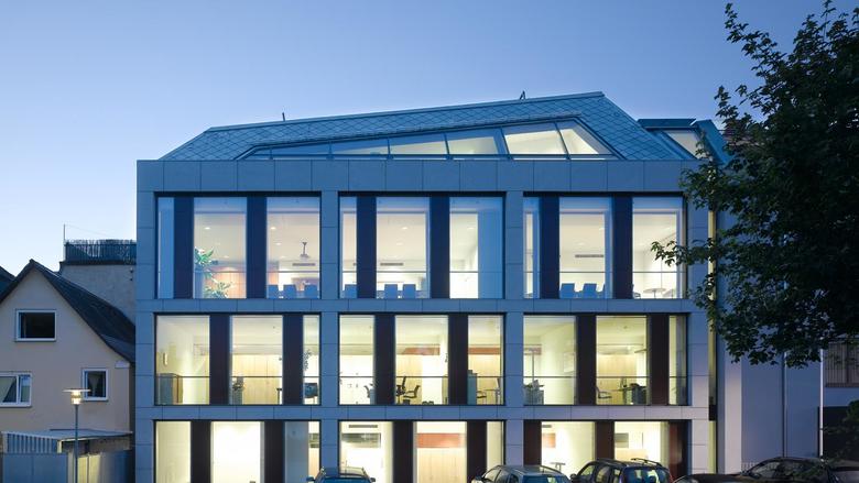 Das Erweiterungsgebäude fügt dem bestehenden Gebäude einen neuen Flügel an. Kleinteiliger proportioniert als der Altbau, vermittelt der Ergänzungsbau mit seiner charakteristische Dachform geschickt zwischen Volksbankgebäude und den benachbarten Altstadthäusern. Seine asymmetrisch aufgeteilte Fassade überrascht mit aufklappbaren Elementen, die der Lüftung dienen. Ein dunkelrot eingefärbter Gebäudekern bildet zusammen mit dem Treppenhaus das architektonische Herzstück des Hauses. Die großzügige Treppe gewährt räumliche Durchblicke und wird so zum räumlichen Kontinuum zwischen den Etagen. Ergebnis ist ein kommunikatives und offenes Haus. Der kompakte, 1300 Quadratmeter umfassende Grundriss mit seiner nahezu quadratischen Grundform eignet sich ideal für eine flexible Nutzung im Sinne der Volksbank Schwäbisch Gmünd. Die Grundstruktur ist in allen Geschossen gleich und lässt eine flexible Aufteilungen der hellen und komfortablen Arbeitsräume zu. Unsichtbar und lautlos, aber mit großen Auswirkungen auf die Wirtschaftlichkeit und das Raumklima arbeitet die Betonkern-aktivierung des Neubaus. Der durch Erdwärme erwärmte bzw. gekühlte Betonkern ermöglicht die Temperaturregulierung über das gesamte Jahr und erübrigt den Einsatz fossiler Brennstoffe.