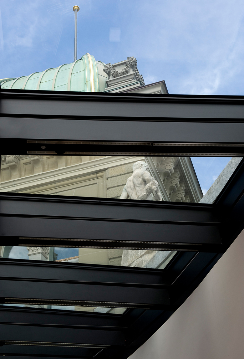Im Geschoss um die grosse Kuppel herum entstanden modernste Konferenz-, Sitzungs- und Büroräume, die dank der grossen Oberlichter lichtdurchflutet sind, zugleich aber eine neue Sicht auf die Kuppel gewähren. Hier lassen sich die im ganzen Haus angestrebte Verbindung und das Gleichgewicht von Alt und Neu am deutlichsten erleben. Die Haustechnik konnte an einem neu geschaffenen Standort zentralisiert werden. So ergab sich die Möglichkeit, von der Bundesterrasse her einen repräsentativen Publikumseingang zu schaffen. Dadurch erhält die südliche Bundesterrasse mit der reich gestalteten Südfassade des Gebäudes eine neue Bedeutung.