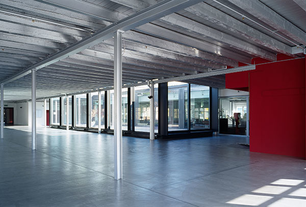 Eine über 1000m2 grosse Lagerfläche im 1.Obergeschoss wurde durch den Einbau eines allseitig verglasten Lichthofs in attraktive Dienstleistungsflächen umgenutzt. Das neue Atrium gliedert den grossen Innenraum in zwei Bereiche und verbessert wesentlich die Belichtungsverhältnisse. Gleichzeitig entsteht ein vielfältig nutzbarer Aussenraum, der zu einem Mehrwert für die angrenzenden Dienstleistungsflächen führt. Die bestehende Tragstruktur mit Primarträgern aus Stahl und Sekundärträgern aus Holz bleibt weitgehend erhalten. Die rustikal wirkenden Holzschalung und Balkenlage werden durch einen silberfarbenen Anstrich veredelt. Die beiden Vertikalerschliessungen werden in einem kräftigen Rot gestrichen.