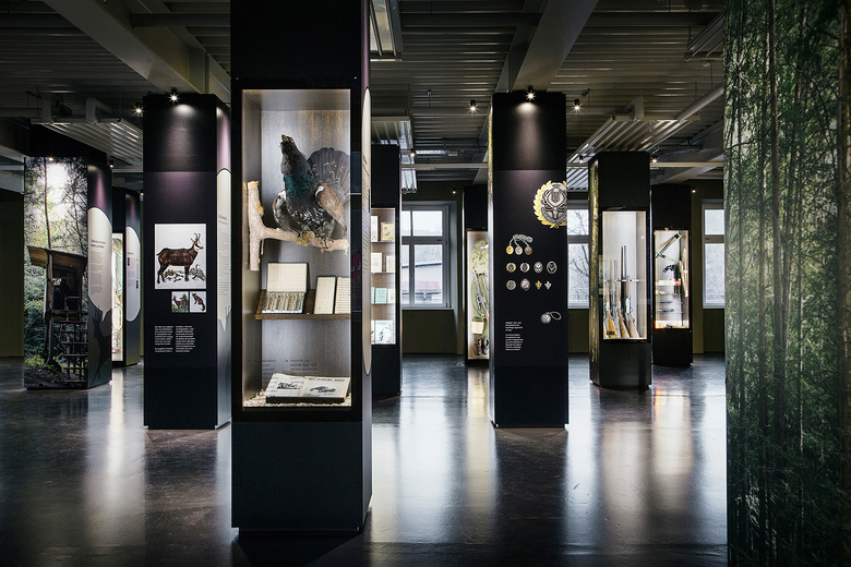Das Vorarlberger Jagdmuseum eröffnet den Reigen der Museen im zweiten Ober-geschoss der Vorarlberger Museumswelt. 20 Stelen bilden einen Säulenwald, der auf seinen vier Seiten vier Erzählsträngen Raum bietet. Dem Wald, den heimischen Wildarten, der Geschichte und der Sammlung der Vorarlberger Jägerschaft.