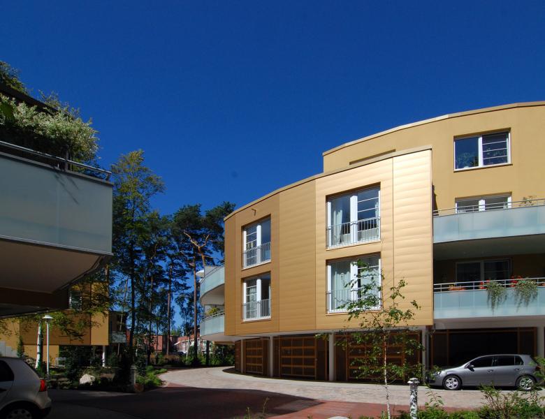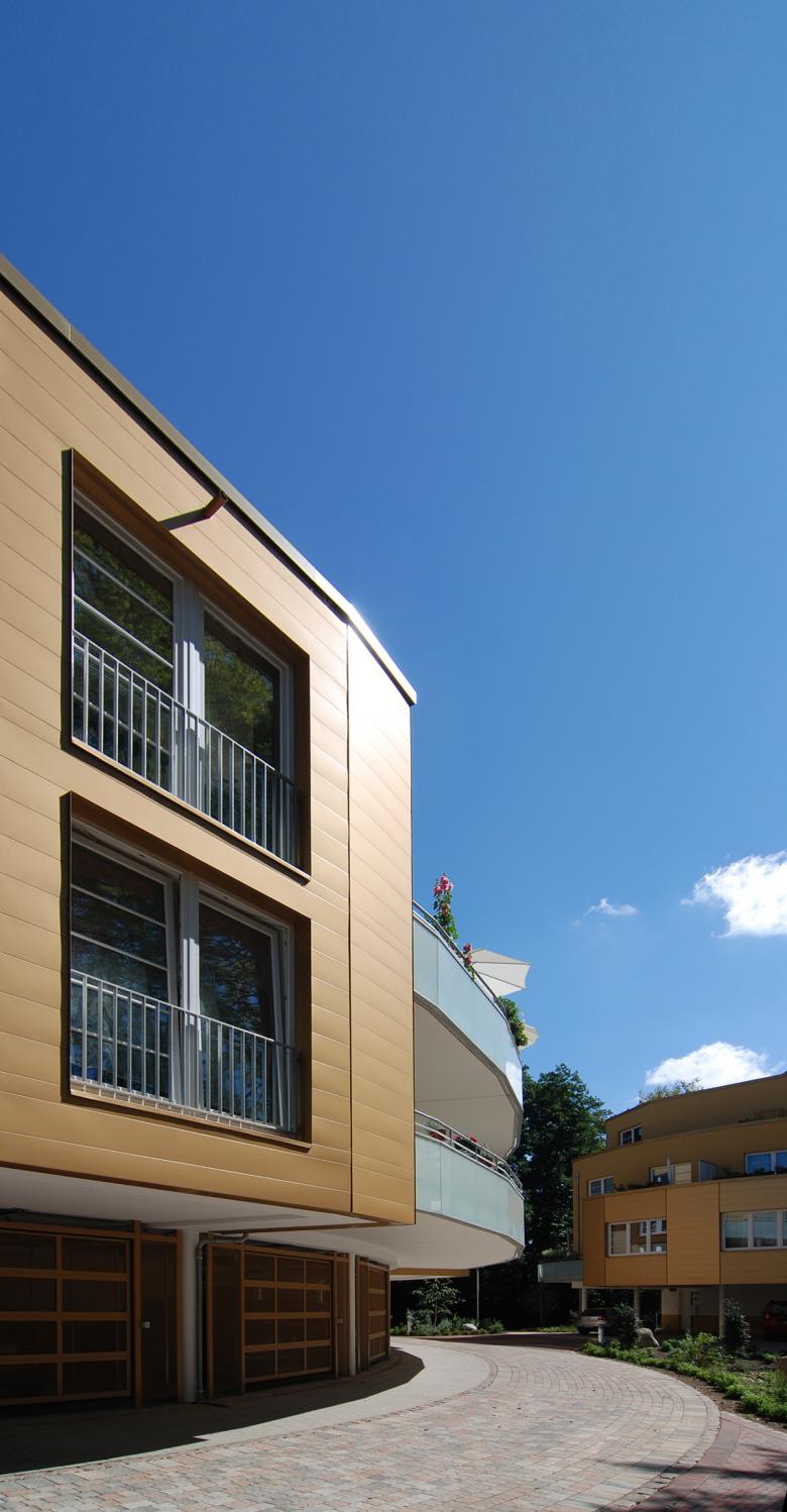 Quartiersverbindende Fußwege führen durch das Grundstück. Vor der Bebauung war das Grundstück aus der Stadt „herausgefallen“, mit einem Buchenwald-Wildwuchs abgesperrt als Villengrundstück. In Zusammenarbeit mit dem Denkmalschutzamt blieben die Bestandsvilla und das dazugehörige Torhaus in der Mitte des Grundstücks erhalten. Bezirk und Stadt ließen das Bebauungskonzept aufgrund seines innovativen ganzheitlichen Charakters zu und begleiteten die intensive Planungsphase. Das Quartier besteht aus 66 Wohnungen, teils als Fünf-Zimmer- Familien - Stadthaus, teils als seniorengerechte Geschosswohnungen. Die in warmen Goldtönen schimmernden Aluminiumfassaden harmonieren mit erdfarbenen Putzflächen und transluzenten Brüstungen. Je nach Jahreszeit und Tageszeit sind Licht und Raum immer wieder neu erlebbar.
