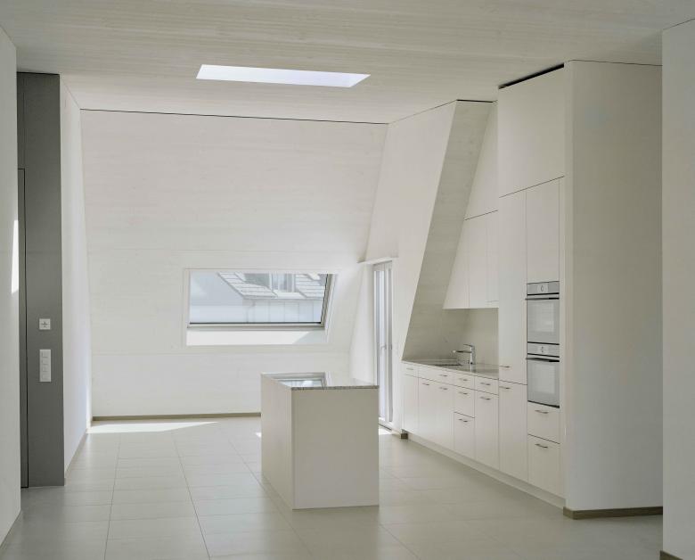 Sämtliche Wohnungen orientieren sich auf die beidseitigen Grünräume und profitieren von der Ausrichtung nach Westen, Osten und Süden. Die durch die gesamte Gebäudetiefe gehenden Wohnräume ermöglichen auf unterschiedliche Wohnformen und Lebenssituationen antwortende individuelle Nutzungen und werden um autonome Einheiten aus Zimmern und Bad ergänzt.