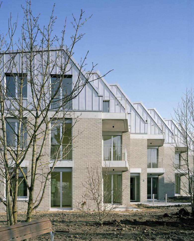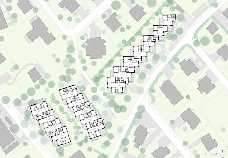Die Typologie der Gebäudezeilen nimmt mit ihren rhythmisierten Fassaden den Charakter von Reihenhäusern auf. Die Baukörper integrieren sich über diese Staffelung selbstverständlich in die kleinräumige Nachbarschaft der bestehenden Wohnzone. Gleichzeitig bietet die Staffelung grosse Privatheit für die Bewohner: innerhalb der Wohnung und auf den grosszügigen Aussenräumen.