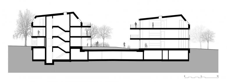Die Materialisierung unterstützt die angestrebte Einheit von Haus und Aussenraum, von Gebäudeensemble und Landschaft. Das helle Mauerwerk wird zum prägenden, sinnlich erfahrbaren Material: Fassaden, Gartenmauern, Wege und Plätze bilden als Einheit aus Stein einen Kontrast zum Grün der Freiräume mit grosszügiger Landschaftsparkatmosphäre.