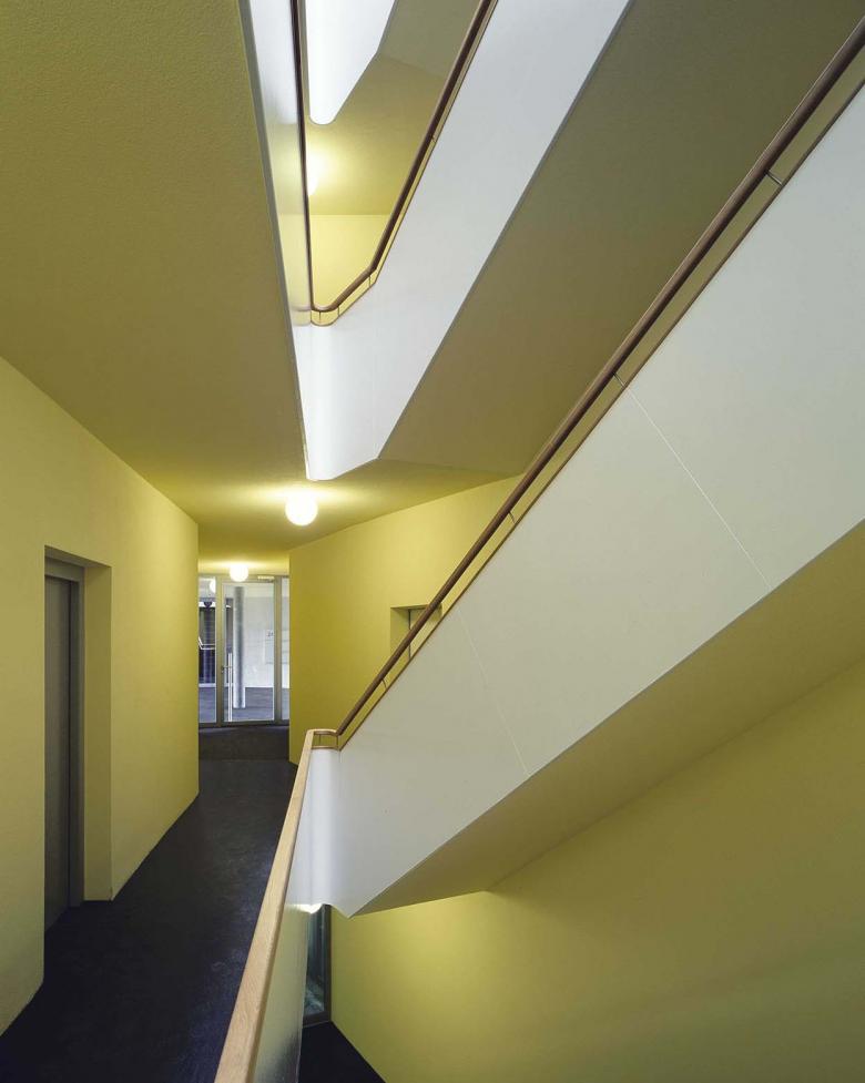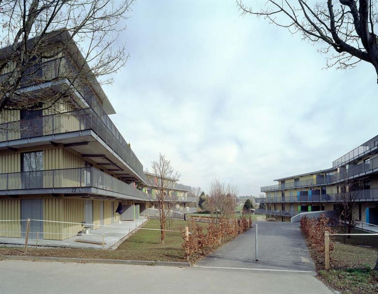 Sieben Baukörper stehen aufgereiht entlang der Wolfswinkelstrasse. Sie orientieren sich in ihrer Dimensionierung an der umgebenden Bebauung. Quer zur Strasse gestellt, erlauben sie den Durchblick in die offene Landschaft. Die einzelnen, dreigeschossigen Häuser bilden durch Knickung der Fassaden grosszügige interne Siedlungsräume. Die Einschnürung schafft zwei zentrale Schwerpunkte im Gebäude. Hier liegen die grosszügigen, von oben belichteten Erschliessungshallen. Die Wohnhäuser der ABZ stehen in einem grosszügigen Park. Der Niveauunterschied von ca. einem Geschoss wird durch eine bespielbare Böschung ausformuliert, die den Durchfluss der Landschaft unterstützt und den Blick in die Weite ermöglicht. Die Überbauung wurde im Minergiestandard ausgeführt.