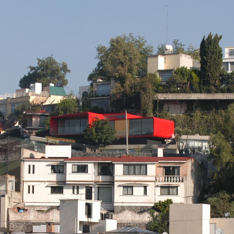 Located in Tecamachalco, State of México, on a hillside overlooking Bosques de Reforma, an existing late 60’s house required a renovation and an extension. Since the client bought the house for its distribution, the existing house was carefully cleaned out, leaving bigger and better areas, then a new part of the program was required, an independent apartment for the client’s daughter. Inside the garage there are 2 separate entrances, providing total independence to the extension, which is accessed through a spiral staircase going 2 flights up. Resembling a ballet, displaying 2 bodies in motion, the looping sensual forms of changing angles coming out of every curve, where inspired by the ballet dancer who is going to inhabit it. The apartment consists of 2 half levels, the first contains the kitchen, dining and living area, then a half flight down; the t.v. room and the master bedroom. Taking advantage of the roof of the existing house and its skylights, this roof becomes a terrace built with the remaining of the chipped lava rocks used for the main wall of the house, the skylights become acrylic stools, benches and chaise lounges that change color with an LED system. A selection of pre-hispanic organ plants adds a touch of vegetation giving this area a lunar feel.
