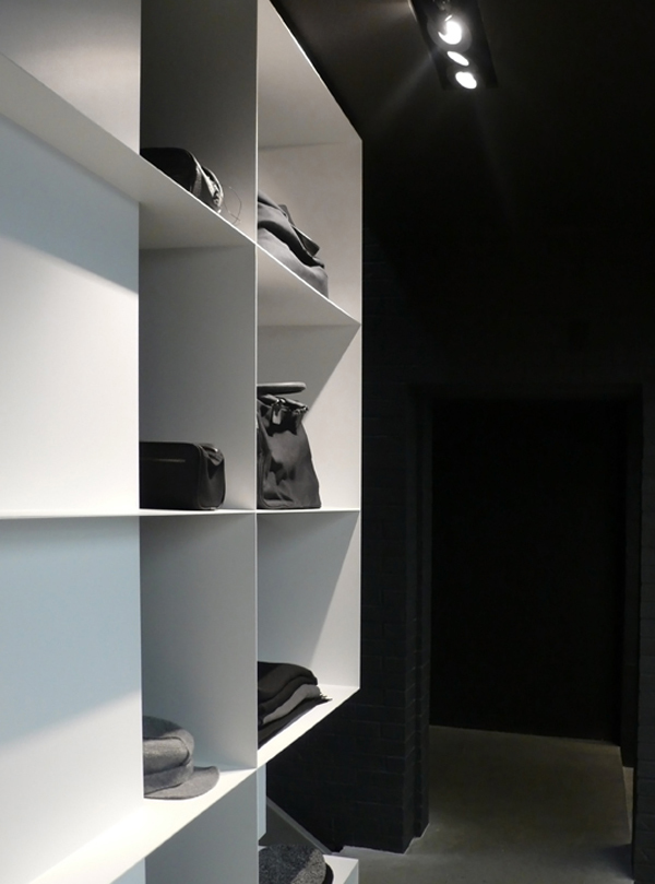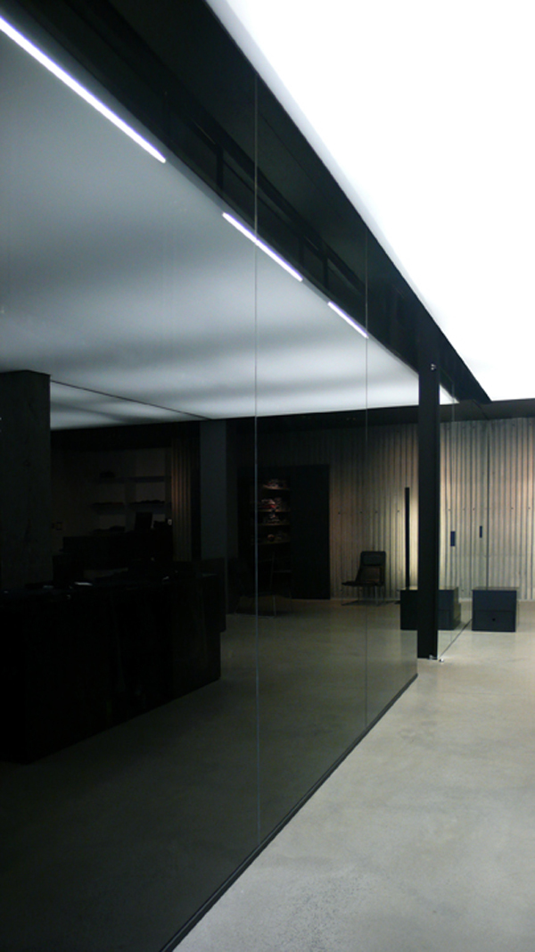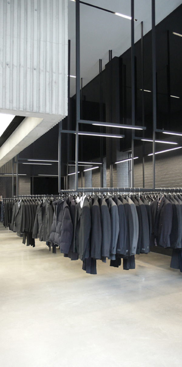 The ensemble of the new elements, such as smoked glass, mirrors, and movable display elements (of painted aluminum and rubber) work in counterpoint to the building’s original structure. The luminous ceiling (Extenzo) stretches to fit the form of the mezzanine; the ceiling therefore illuminates the zone of the movable display cases, and contrasts with the clothing racks, which function as linear lighting for the space, suspended from the second floor ceiling like stalactites. The original curving staircase dramatizes the moment one reaches the second floor, where we find Michel Brisson’s office and the V.I.P. room. Various service spaces are also located on the second floor, toward the south portion of the building.