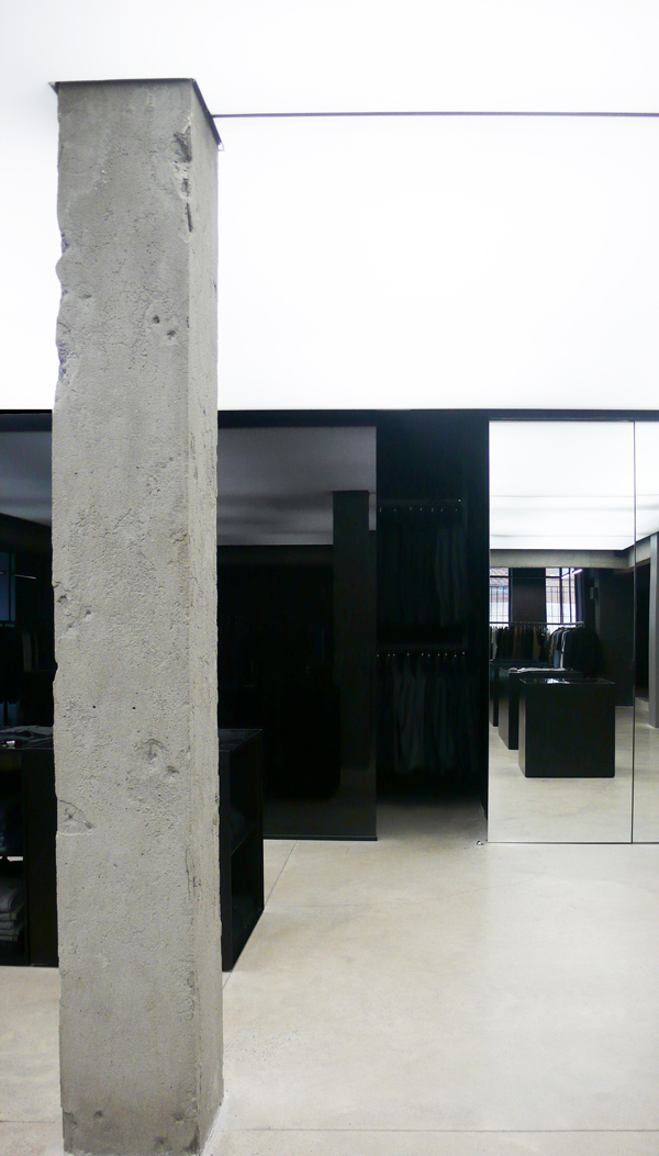 To transform this seventies era, modern heritage building (formerly a National Bank) into a new space dedicated to contemporary fashion, the first step taken by the architects was to simplify the overall structure, which had been subjected over the years to a series of additions and renovations. The building's interior was thus stripped to its original brutalist structure, which revealed itself to be surprisingly striking. The sculpted, corrugated concrete of the vault and mezzanine, the structural supports, and the original exterior brick together became the mineral shell from which the project took shape.