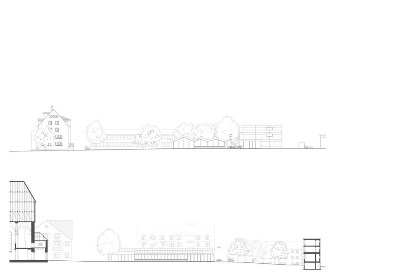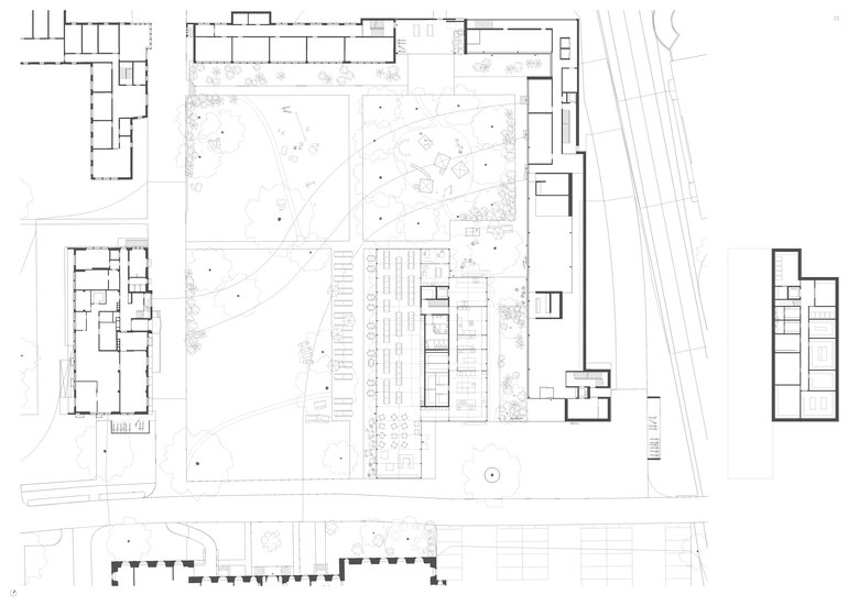 Die Platzierung des Neubaus scheidet zwei verschiedene Aussenräume aus. Die bestehenden, teils asphaltierten, teils gepflasterten Flächen zwischen Klosterkirche und Haus Domino bleiben in diesem städtischen Charakter erhalten und werden lediglich durch eine Sommerlinde ergänzt. Das prägnante Vordach vor Cafeteria und Shop bildet einen einladenden Vorbereich. Die angrenzende asphaltierte Fläche vor der Produktionsküche dient als Kurzzeitstellplatz und Wendebereich der Anlieferung. Zwischen Zentralgebäude und Haus Domino führt ein breiter Asphaltstreifen, der partiell auch zur An- und Auslieferung genutzt wird, zu einem geschützten Aussensitzplatz. Dieser ersetzt die bestehende Terrasse und dient gleichzeitig dem Aufenthalt der Besucher des Mehrzweckraums im Haus Domino sowie dem Personal der Zentralküche, deren Pausenraum direkt angrenzt. Der Raum befindet sich unter der ausladenden Krone eines Kastanienbaums und ist zweiseitig von Strauchgruppen gefasst. Den asphaltierten Weg begleitet eine Zierrabatte. Sie ist zu den Enden hin mit Sträuchern bepflanzt und mittig von niedrigen Stauden und Blumen bedeckt. Die Rabatte bildet damit ein sich mit den Jahreszeiten veränderndes Bild für das Foyer zur rechten und die Arbeitsräume der Küche zur linken Hand. Dem Aussensitzplatz folgt ein ringförmig angeordneter Baumhain aus Buchen mit hoch ansetzenden Kronen. Vier Pfade über die umgebende Rasenfläche führen zum mittig liegenden, bekiesten Spielplatz. Dieser entspricht in der Grundfläche etwa dem bestehenden Spielbereich. Zur Südseite hin nimmt der Hain die Flucht des Zentralgebäudes auf und schliesst so die grosse Parkfläche räumlich ab. Diese ist nur punktuell mit Bäumen versehen. So soll der Raum zwischen Kloster und Schule als Einheit gelesen werden. Neben dem rechtwinkligen, am Ort vorherrschenden System der Hauptwege führen untergeordnete geschwungene Pfade über die Wiesen und bilden so kleine Schleichwege zum Speisesaal. Zugleich trennen sie höher bewachsene Blumenwiesen von kurzgeschnittenen Spielwiesenflächen ab. Die bestehende Zierrabatte unmittelbar vor dem Schulgebäude bleibt ebenso erhalten wie das schützende Vordach zwischen Haus Gallus und Haus Domino und mehrere grosse Laubbäume. Die im Zuge der Umlegung der Lindenhofstrasse erstellte Parkierungsanlage wird mittels neuem Durchgang zum Vorbereich des Schulgebäudes neu mit dem Wegsystem des Parks verknüpft. Entlang des Hauses Domino führt ein chaussierter Gehweg, der optional mit kleinen Treppen eine Verbindung von Innenraum und Parkanlage anbieten kann. Entlang der Fassade des Speisesaals weitet sich der mittige Gehweg zum grosszügigen Sitzplatz. Dieser ergänzt den befestigten Bereich unter dem ausladenden Vordach. Die parkartige Anlage bietet dem Johanneum insgesamt einen neuen Typus von Grünraum. Neben den weiten umgebenden Wiesen, den Wäldern und der eigenen Insel in der Thur wird dieser gefasste, dichte Raum zum zentralen kollektiven Treffpunkt und Aufenthaltsort.