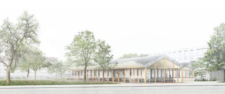 Das Hauptmerkmal des Hauses bildet der schlanke, parallel zum Park verlaufende Saal. Dieser fasst die Nutzungen von Shop, Theke, Cafeteria und Speisesaal zusammen und bildet am Ende auf selbstverständliche Art und Weise eine Hauptadresse zum Kirchenvorplatz. Das Schnittprofil des Raums macht das schützende Dach zum Motiv. Die flächige Beplankung der Deckenunterseite ist hell gestrichen und verleiht dem Saal schlichte Noblesse und Festlichkeit. Durch diese neutrale Leichtigkeit sind viele unterschiedliche Nutzungen des Raumes denkbar. Gleichzeitig bringen die bunten Farbtöne der Möblierung eine Lebendigkeit mit, die im Farbspektrum des Parks seine Fortsetzung findet. Das geringe Achsmass der Struktur ermöglicht schlanke Stützen die mit den Rahmen der raumhohen Fenstertüren deckungsgleich sind. Die gleichmässige Befensterung entlang des gesamten Saals – gartenseitig vollständig öffenbar - wird so zum Panoramablick in den Park. Die transparenten Enden des Raums unterstreichen diese Offenheit und ermöglichen differenzierte Blicke in die unterschiedlichen Teile des Parks. Gleichzeitig ist es prinzipiell möglich, den Raum mittels Vorhängen in regelmässigen Abständen zu unterteilen. Die zentrale Schicht des Gebäudes beherbergt sämtliche Nebenräume der Küche, sanitäre Einrichtungen sowie die Erschliessung des Untergeschosses. Die dem Speisesaal gegenüberliegenden Räume umfassen die Arbeitsräume der Grossküche. Diese sind über der Arbeitshöhe verglast und ermöglichen Blickkontakt untereinander sowie die Sichtbarkeit des durchlaufenden Dachprofils. Die serielle Anordnung der Arbeitsräume in Kombination mit dem rückwärtigen Korridor erlauben effiziente Arbeitsabläufe mit kurzen Distanzen und eine einfache Trennung zwischen sauberen und schmutzigen Zonen. Die lange Theke im Saal kann über das Office bedient werden, während das Schmutzgeschirr auf der anderen Seite zum Abwasch transportiert wird. Die zur Umgebung niveaugleiche An- und Auslieferung erfolgt über den asphaltierten Weg. Das Untergeschoss mit zentralem Korridor ist flächenoptimiert und bietet trotzdem ausreichend Raum zum Rangieren von ein- und ausgehendem Material. Die Fassade ist umlaufend mit Fenstern auf unterschiedlicher Höhe versehen und ermöglicht dem Haus zu allen Seiten hin eine differenzierte Beziehung zum Aussenraum herzustellen ohne explizite Vorder- und Rückseiten auszubilden. Der Betrieb der Küche ist so vom Kirchenvorplatz als auch vom Foyer im Haus Domino aus sichtbar und erhält Wichtigkeit und Präsenz.