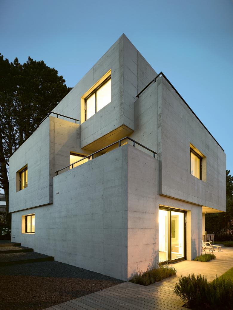 The tapered 500 square-metre property is situated on a ridge on the right bank of Lake Zurich. The structure’s dimensions result from the contracting shape of the plot. The detached house comprises two full storeys with an attic and a basement including an underground car park. The projecting and receding levels of the single-shell concrete construction appear deliberately stacked on top of each other and create balconies with different orientations. The window openings are positioned precisely in the individual rooms to ensure views of the lake and into the distance. A staircase core runs through the structure like a backbone and holds the compact interior layout together.