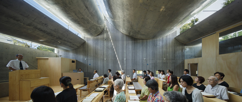 The ribs on the walls controll the sound in the chapel so that the pastor's story can be heard clearly and the hymn echoes elegantly.