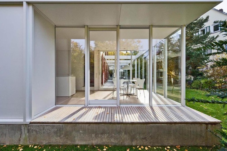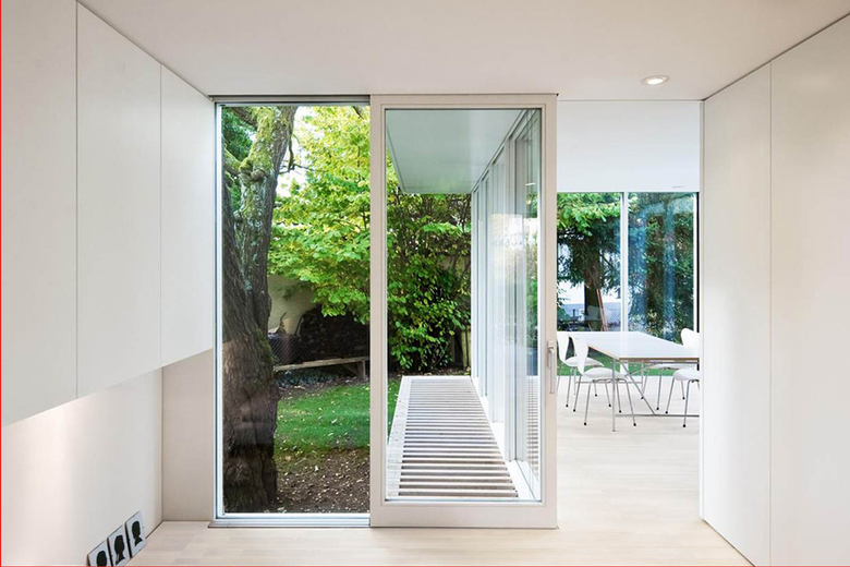 Die erforderlichen Erweiterungen wurden ringförmig um das Haus in einen Sockel gelegt, wie ein Jahresring für das wachsende Haus. Das Alte bleibt dominant, das Neue ordnet sich mit Respekt dem Alten unter. Öffnungen erlauben schöne Durchblicke durch die verschiedenen Schichten. Es entstehen fließende Räume zwischen den Bauteilen. Der lichtdurchflutete Neubau lebt von seiner Transparenz zwischen Innen und Außen und ermöglicht ein Leben mit den Jahreszeiten quasi im Freien.
