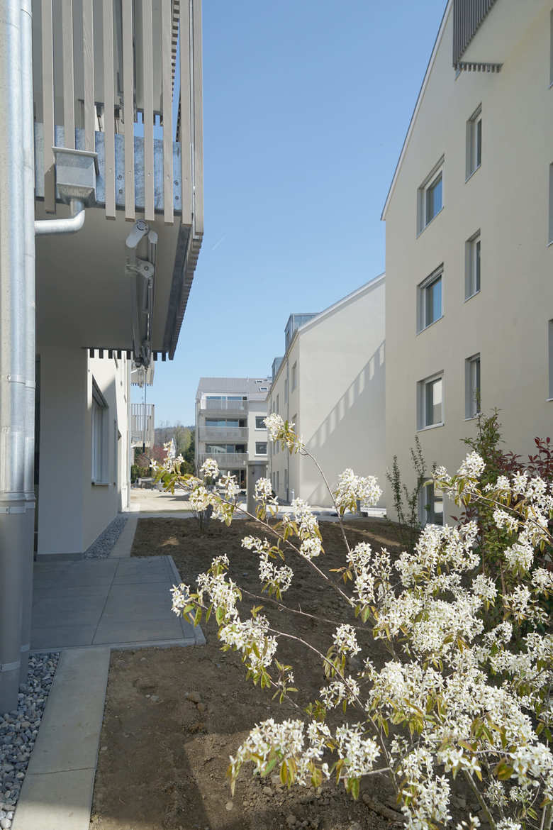 eine geschwungene wegführung zieht sich durch die anlage und erschliesst die höher liegenden, hinteren wohnbauten. das öffentliche fussrecht durch das areal wird mittels präziser weggestaltung gewährleistet. im einklang mit grosszügigen grünflächen, bepflanzungen sowie abwechslungsreichen spiel- und aufenthaltsflächen, wird ein harmonischer quartiercharakter erzeugt.