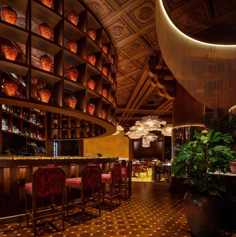 Walls adorned with classic carvings create a mesmerizing backdrop, while plush banquettes featuring intricate Chinese artwork set the stage for a lavish dining experience. As night descends, the central floor illuminates with a subtle glow, creating a magical atmosphere for refined dinners.