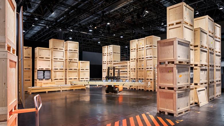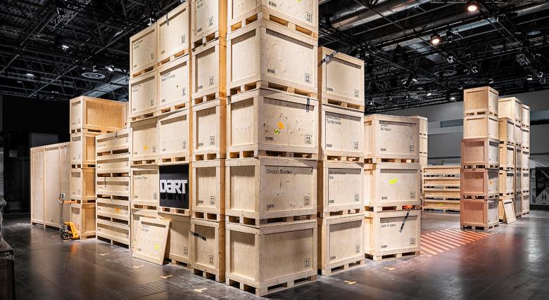 Das Projekt macht zunächst einen ungewohnten Eindruck. Zwischen all den konventionell gestalteten Messeständen ragt eine riesige Kistenburg hervor. Die Kisten sind Crates. Der gemeinsame Nenner im Messebau, der heimliche Held jeder Ausstellung – und für den Besucher doch unsichtbar, weil sie zur Eröffnung stets von der Bildfläche verschwunden sind.