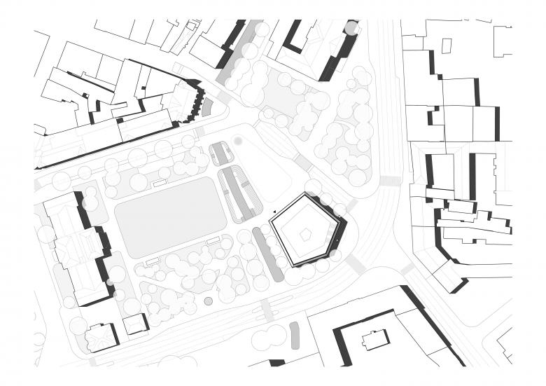 Unser Entwurf für das neue Galeriegebäude ist an einem besonderen Ort am Rande des historischen Zentrums von Budweis geplant, dort, wo früher die Stadtmauern standen. Mit dem Entwurf des Gebäudes und des angrenzenden Platzes bietet sich die Chance, diesem Bereich eine neue Bedeutung zu geben. Unser Design nimmt Elemente der alten Stadtmauern auf und übersetzt sie in eine moderne Form. Dabei legen wir besonderen Wert darauf, das Gebäude offen und zugänglich für die Stadt und ihre Menschen zu gestalten. Mit seiner fünfeckigen Grundform passt es sich dem Bauplatz an, wird nach oben hin schmaler und erinnert in seiner Form an einen alten Festungsturm. Das oberste Stockwerk ist zurückversetzt, dort sollen sich Büroräume und eine Bar mit Aussicht befinden.