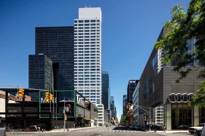 The limestone-clad 611 West 56th Street, a 35-story residential tower designed by Alvaro Siza, is now complete, as documented in photos taken recently by João Morgado.
