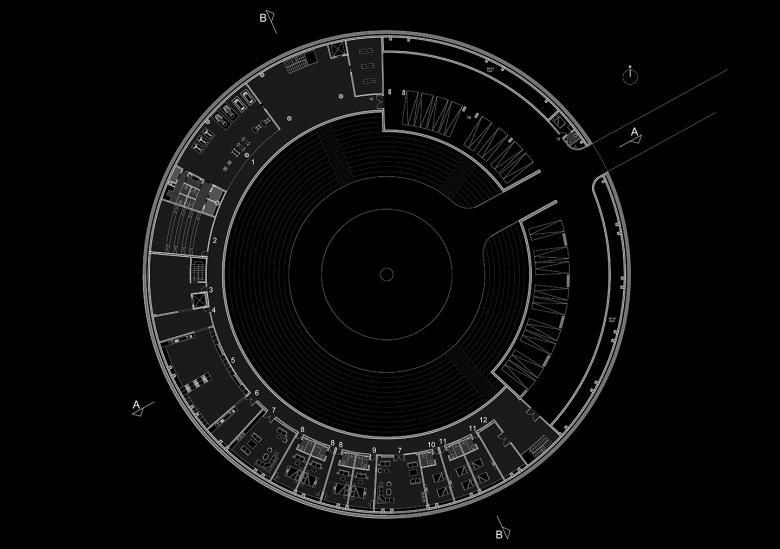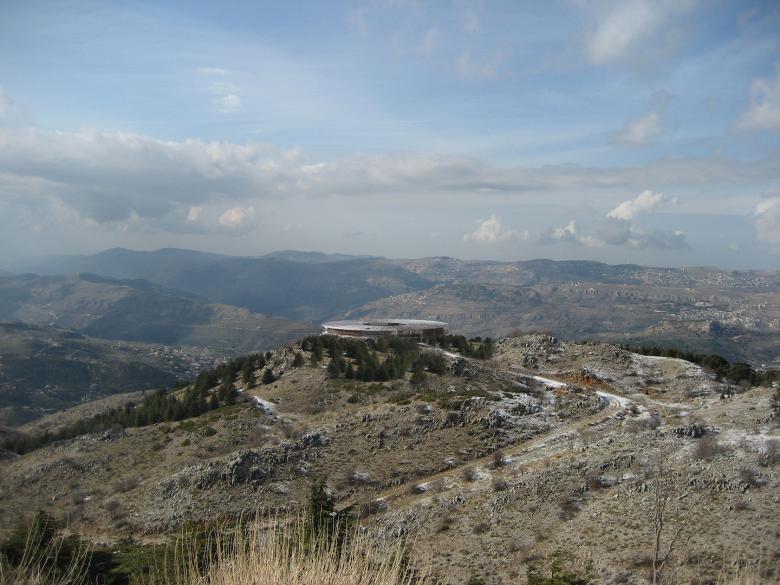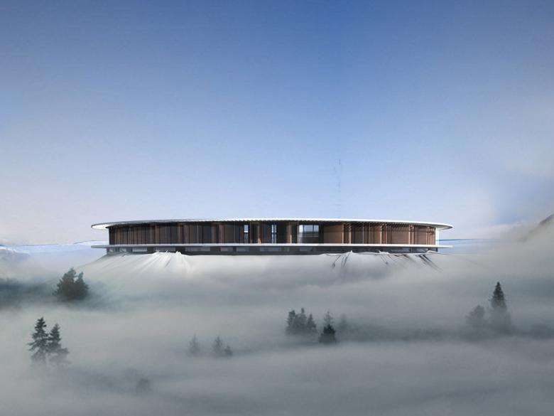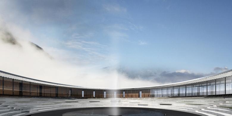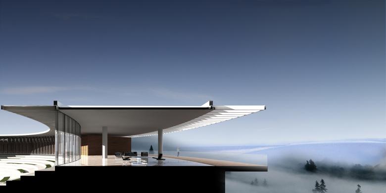 Situated at the highest peak of the Barouk Cedars Nature Reserve in the Chouf Mountains of Lebanon, the project sits on a 6000-square-meter plateau flattened in 1982 by the Israeli military forces to serve as a temporary artillery base. The utopic scenery ruling the site dictates a minimal material intervention and the celebration of transparency. The 360-degree is reconstructed and spread on a circular plane that defines the positioning of the program according to orientations. The fully glazed peripheral façade disappears mechanically into the ground to transform the interior spaces into outdoor belvedere terraces. The only permanent built mass beyond the existing plateau level is the circular ring which defines the roof of the project. The 2500-square-meter project revolves around a central concave void that acts as a central open air courtyard. Rain and snow water are collected and stored below the courtyard in a spherical reservoir of 18 meters in diameter. The reservoir is accessible by an underground gallery and serves as a winter swimming pool that releases a vertical flow of steam at the center of the court above.