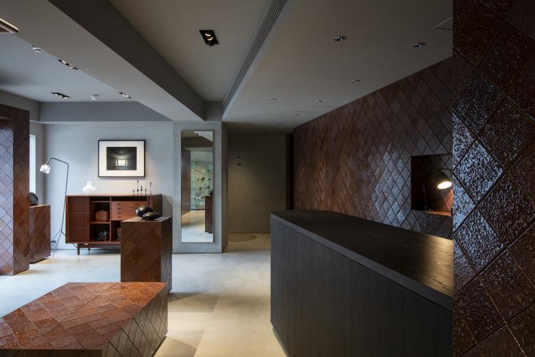 A plan for a new store in Fukuoka by Arts & Science. Based on the concept of “high quality everyday life,” the client has been creating a store by carefully examining products such as clothes and other personal items, as well as crafts and products made by artisans, in pursuit of quality products that will last for years. The project site is located in a quiet residential area not far from Ohori Park in the center of Fukuoka. Ohori Park is a city park that has been familiar to the people of Fukuoka for many years, thus we felt that it would be appropriate to create a space that intersects the client’s philosophy of manufacturing and store design with the significance of this environment. The motif we selected was the reddish-brown tiles that decorate the exterior walls of the Fukuoka City Art Museum, which is located in the park and has also been loved by the public for many years. The tiles used by the late architect Kunio Maekawa had a beautiful texture and glossy glaze as pottery, and we felt that they were a material that symbolized this area in general. We felt that the craft-like beauty of the tiles was compatible with the concept of Arts & Science.