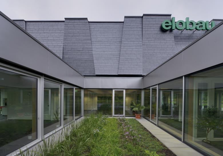 Ein Birkenhain überdeckt locker den Raum entlang des Gebäudes neben der Erschließungsstraße und dem Mitarbeiterparkplatz. Die hellen Birken kontrastieren mit dem schwarzen Schiefer. Zwischen Eingang, Büroräumen, Personal- und Besprechungsraum befindet sich ein eingezogener Lichthof als "grünes Zimmer".