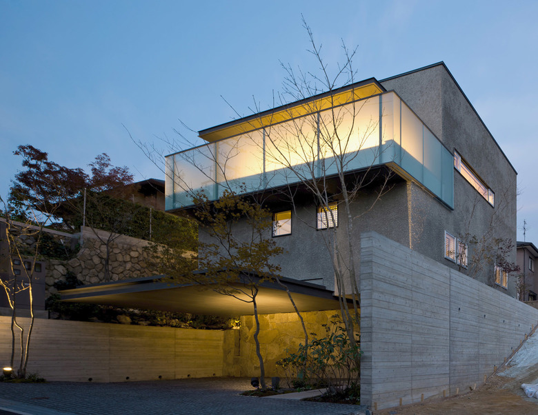 The outer wall completion was made mortar and the settling atmosphere as if it was at this place from before. There is a front door at the place where planting is led to gentle light whichi puts in the inside of planted long approach and is away from the daily pother. When a door is opened, circled space is spread in existence ishichouhei and a wall of the Aji stone wall which continues an natural wood. A guest room is also a practice room of a ballet which serves both here, and a wall of a mirror makes them feel a spatial expanse. To clear regulation of coverage 40% and high slash limitation, a retaining wall was built and ground line was operated.