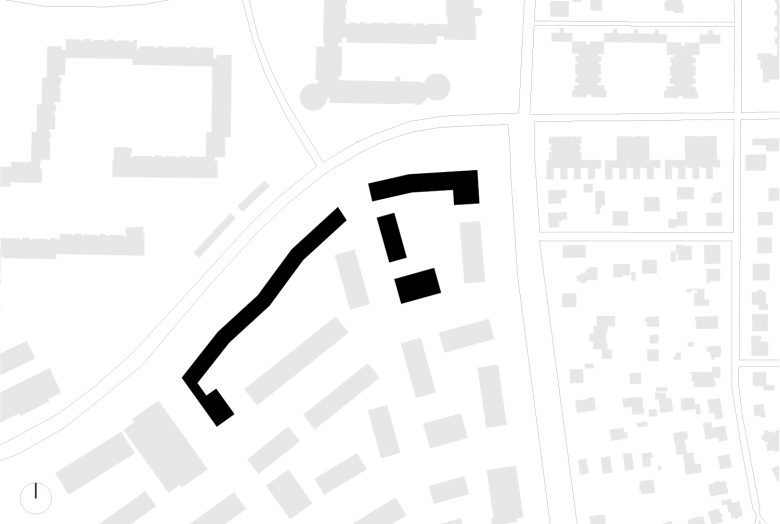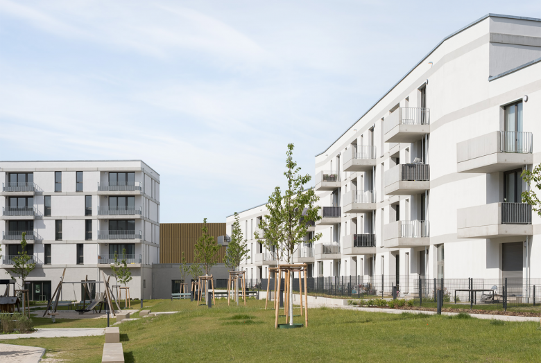 Ein markantes, dem abgeknickten Straßenverlauf angepasstes Gebäude, bildet das Tor zum Viertel. Dahinter entfaltet sich ein lebendiges Wohnensemble: Unterschiedliche Wohnformen gruppieren sich um gemeinschaftlich genutzte Grünflächen und schaffen so einen Ort, an dem Menschen aller Generationen zusammenkommen – mitten im Grünen, mit Raum für Begegnung und Austausch.