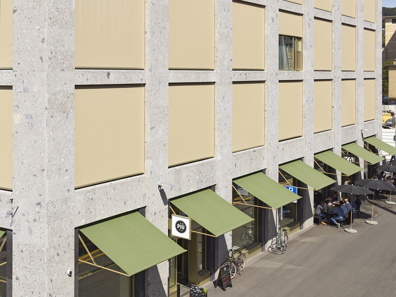 Im Geschäftshaus am Schiffbauplatz sind im Erdgeschoss Verkaufsflächen und Gastronomiebetriebe eingemietet. Zur Beschattung der grossen Fensterflächen wurden verschiedene Bedürfnisse abgedeckt. So sollten die Geschäfte und Gastrobetriebe von aussen gut sichtbar und einladend wirken und sich bei Sonneneinstrahlung nicht unnötig aufheizen und von innen Ausblick gewähren. Eine ideale Lösung für diese Ausgangslage ist die SUNLINE® 6400 von Kästli Storen. Die Ausstellstore ermöglicht dank ihrer Konstruktion auch bei grosser Ausladung grosszügige Durchgangshöhen und lässt Passanten ungehindert zirkulieren. Die aus Stahl gefertigte filigrane Store eignet sich auch für Balkone und macht sich sowohl an historischen als auch an modernen Gebäuden gut.