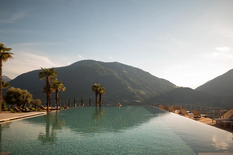Interior Design des neuen Innen- und Außenpools und der Fitnessbereiche im Hotel Castel.