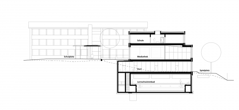 - Dorf- und Pausenplatz. Aula, Saal, Bibliothek/Mediathek, 5 Klassenzimmer, Gruppenräume, Schulverwaltung, Hort, Krippe, Schulschwimmanlage. Minergiestandard.