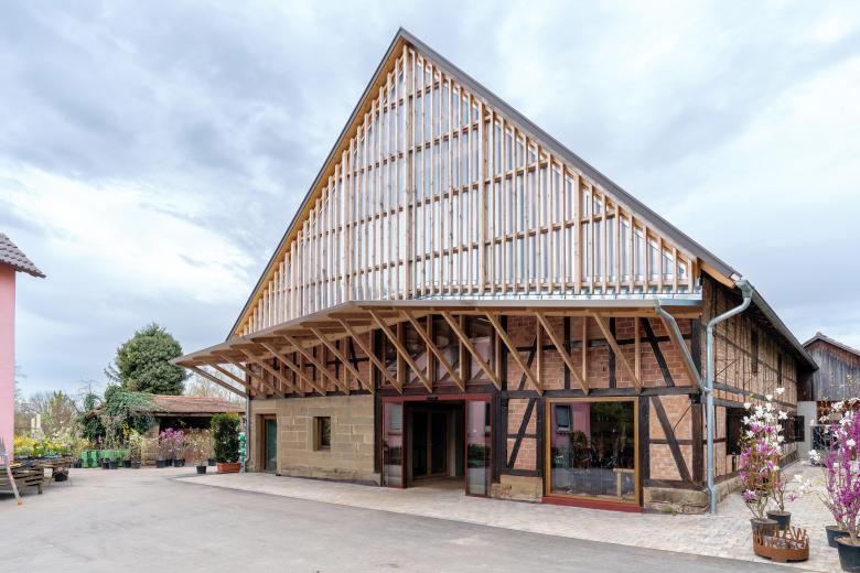 Wie können die Qualitäten der Scheune mit Natursteinmauer, Fachwerk und charakteristische Holzkonstruktion herausgearbeitet werden und zu einem neuen Zentrum der Bauschule umgestaltet werden ohne grosse Änderungen an den vorhandenen Strukturen vornehmen zu müssen? Ein ‚Haus im Haus‘ Konzept, nutzt die bestehende Scheune als Witterungsschutz. Der beeindruckende Innenraum wird von Einbauten befreit und präsentiert sich nun als grosses Raumvolumen. Die neuen Nutzungen werden geschickt in das Stabwerk eingeflochten, um die Struktur als Ganzes zu erhalten. Zwei bauliche Elemente ergänzen die Scheune: das Bürobrückenhaus mit Sanitärbereich und Kasse im Erdgeschoss sowie die vorgehängte Fassade mit Vordach. Bestehende Öffnungen im Gebäude werden reaktiviert, um das Innere in die alltäglichen Abläufe der Gartenausstellung, der Besuchenden und der Mitarbeitenden zu integrieren.